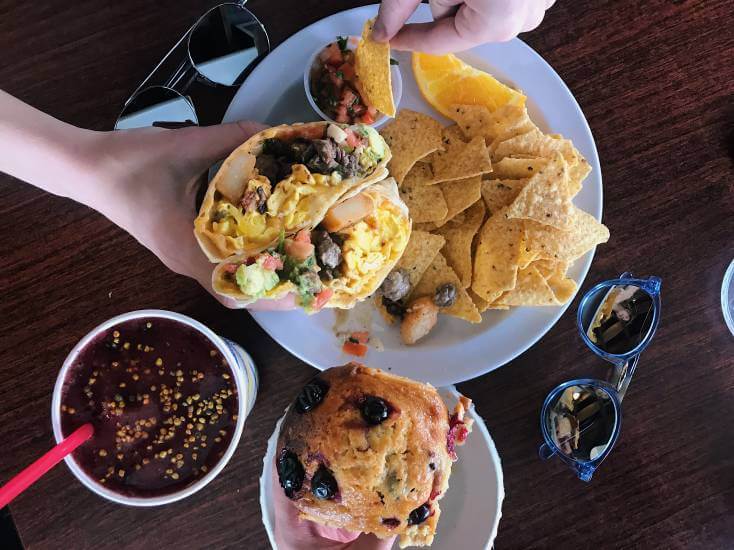 For drinks, you must order their Original Orange Inn Smoothie made with fresh strawberries, blueberries, bananas, dates, fresh juice, bee pollen and crushed ice. Also take advantage of their all-day breakfast and secure one of the muffins baked each day with freshly squeezed orange juice inside and a breakfast burrito. While all are great, a favorite is the Steak and Egg Burrito which has a thin and toasty tortilla, tender pieces of steak, fluffy scrambled eggs, in-house pico de gallo, cheese, and potatoes. We also add avocado because that always seems to make everything just a bit better.
