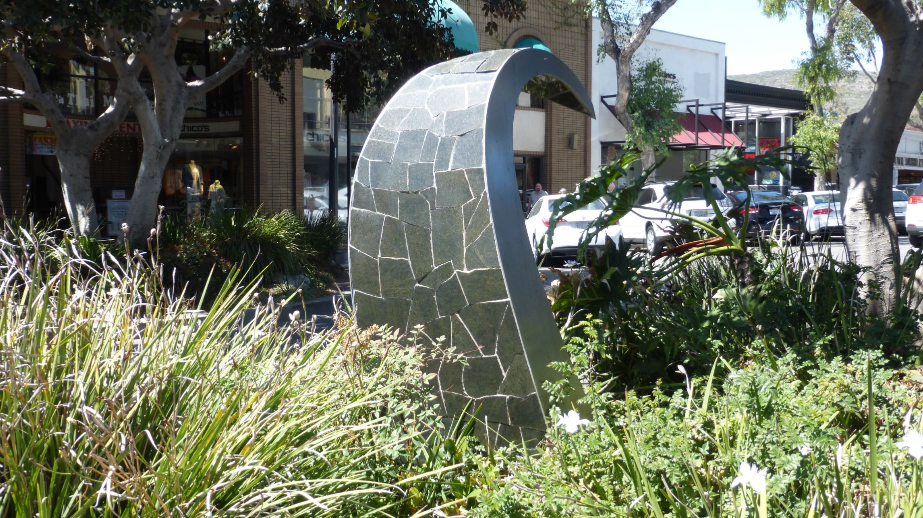 The abstract ocean wave forms have been created of stainless steel and granite by Laguna Beach artist Larry Gill. Larry said, “I believe art is a kind of energy. I look for beauty and awe to empower a piece of artwork.”