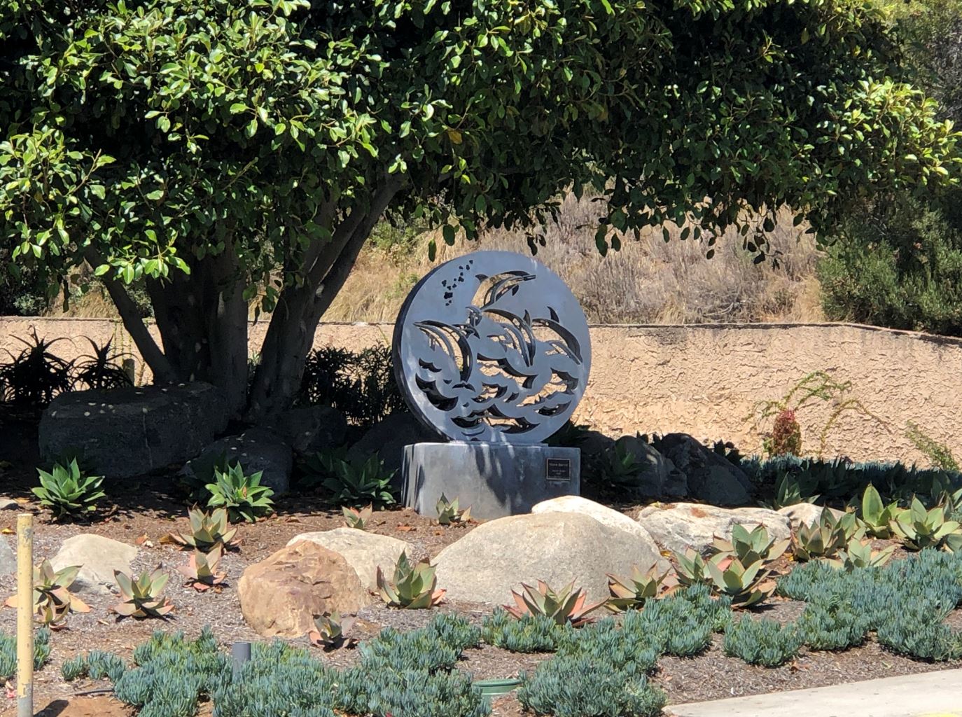 Laguna Beach artist March Scott explained her work “Wave Dance” as “celebrating the joy of watching the dolphins off the coast. Seeing them jumping in the waves in their small groups are treasured moments while walking, running or just sitting along the beach.”